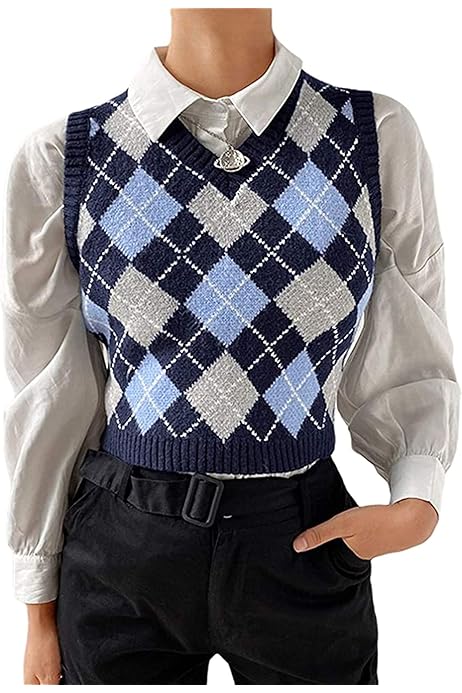 Women Sleeveless Argyle Plaid Knitted Sweater Vest Loose Streetwear Preppy Style Knitwear V Neck Crop Tank Top A Blue One Size At Amazon Women S Clothing Store